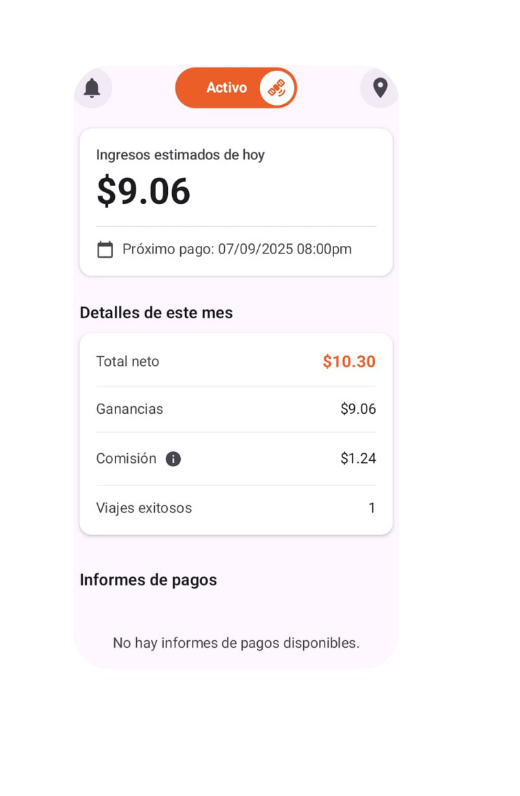 Nuestra aplicación te permite monitorear tu rendimiento e ingresos diarios con total transparencia. Ve el resumen de tus ganancias, viajes completados y las horas que has dedicado.